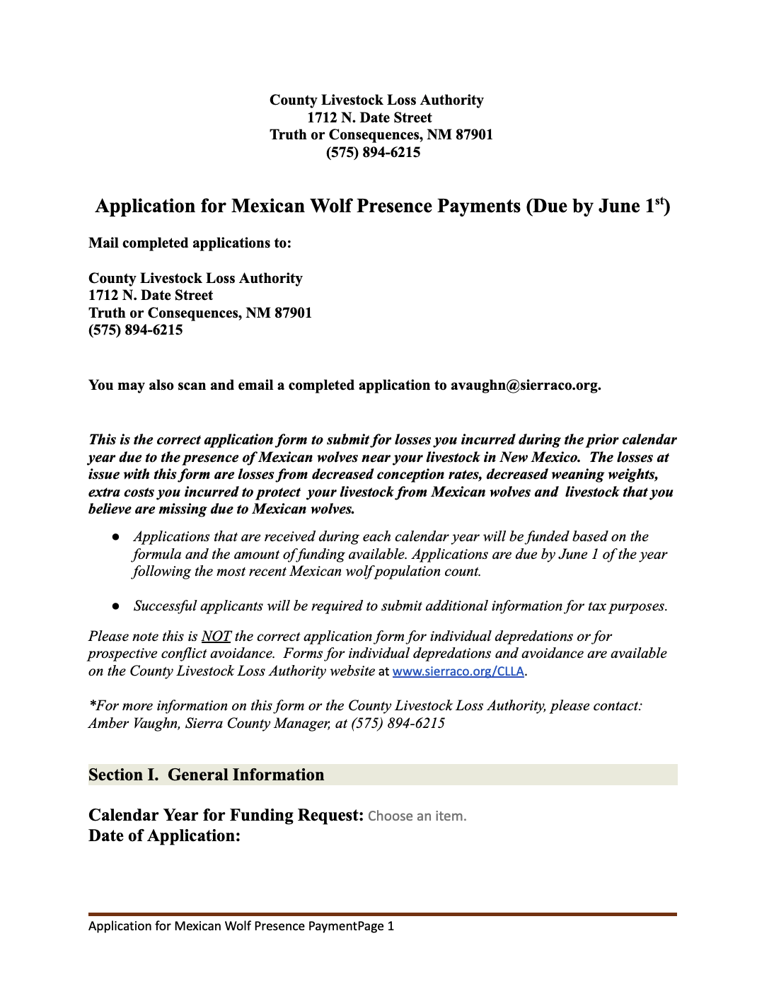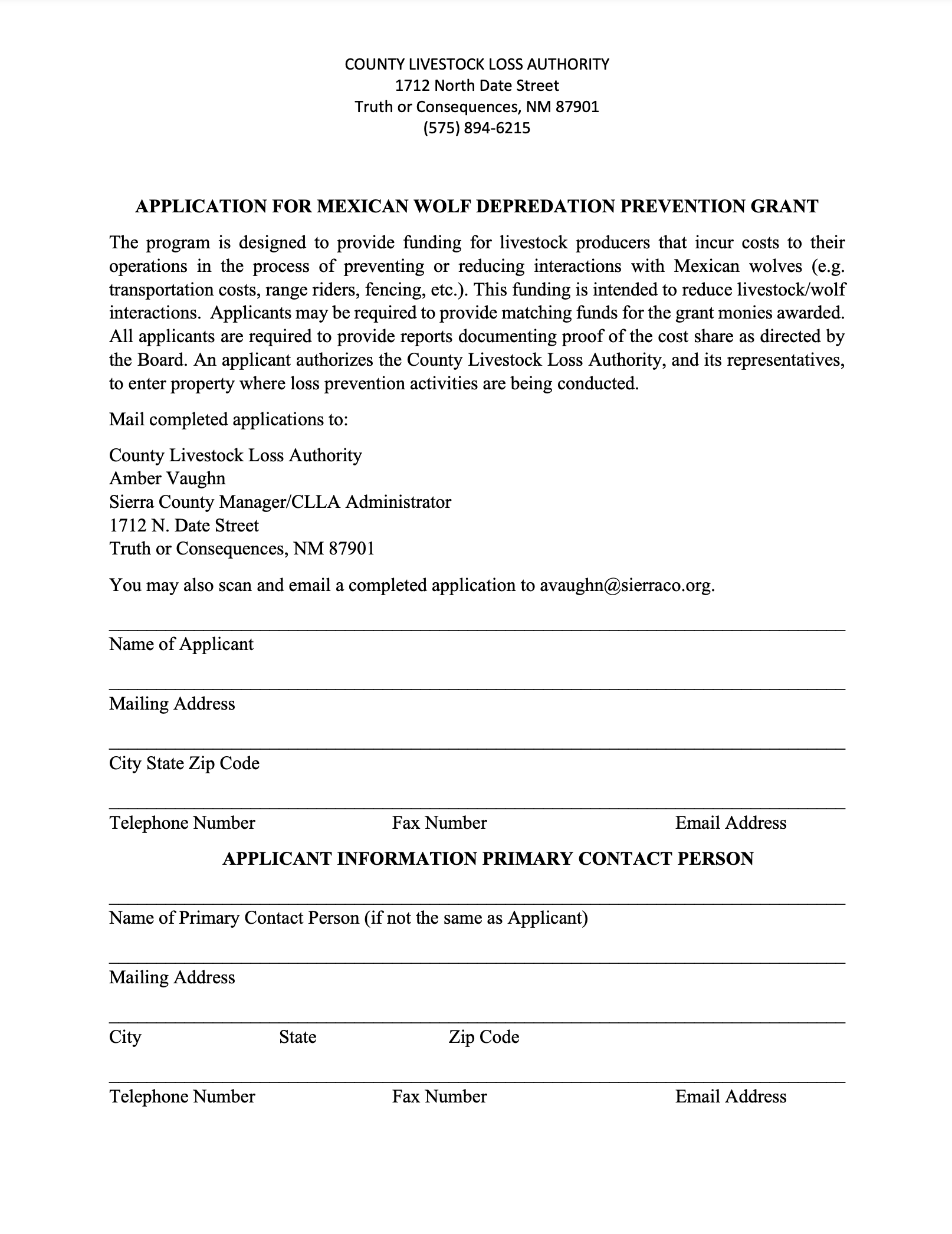 The program is designed to provide funding for livestock producers that incur costs to their operations in the process of preventing or reducing interactions with Mexican wolves (e.g. transportation costs, range riders, fencing, etc.). This funding is intended to reduce livestock/wolf interactions. Applicants may be required to provide matching funds for the grant monies awarded. All applicants are required to provide reports documenting proof of the cost share as directed by the Board. An applicant authorizes the County Livestock Loss Authority, and its representatives, to enter property where loss prevention activities are being conducted.